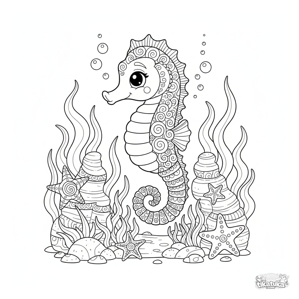 Detailliertes Ausmalbild für Kinder von 7-12 Jahren: ein Seepferdchen schwimmt zwischen Korallen und Seetang. Komplexe Muster.