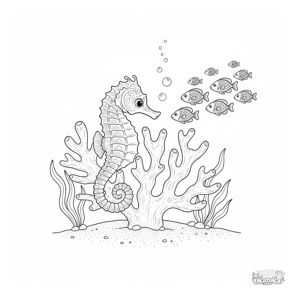 Detailliertes Ausmalbild für Kinder von 7-12 Jahren mit einem Seepferdchen. Das Unterwassertier um einen Korallenzweig gewickelt, zwischen Fischen und Algen.