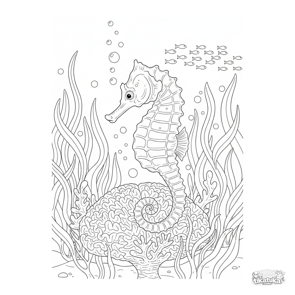 Ausmalbild für ältere Kinder 7-12: Ein zartes Seepferdchen, das sich um Hirnkorallen in einem Seetangwald windet und einen Fischschwarm beobachtet. Detaillierte Unterwasserszene.