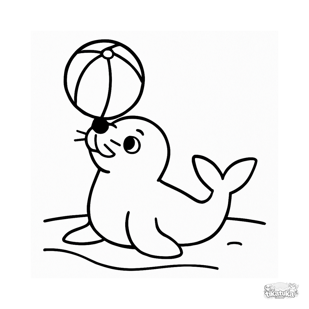 Ausmalbild für Kinder. Eine süße graue Robbe balanciert einen bunten gestreiften Wasserball auf der Nase am Sandstrand. Kostenlos herunterladen.