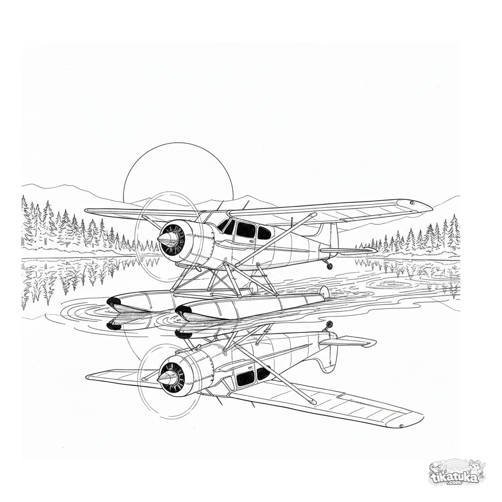 Ausmalbild eines Wasserflugzeugs, das auf der ruhigen Oberfläche eines Bergsees bei Sonnenuntergang fährt. Detaillierte Szene mit Reflexionen und Kiefern. Für 10-12 Jahre.