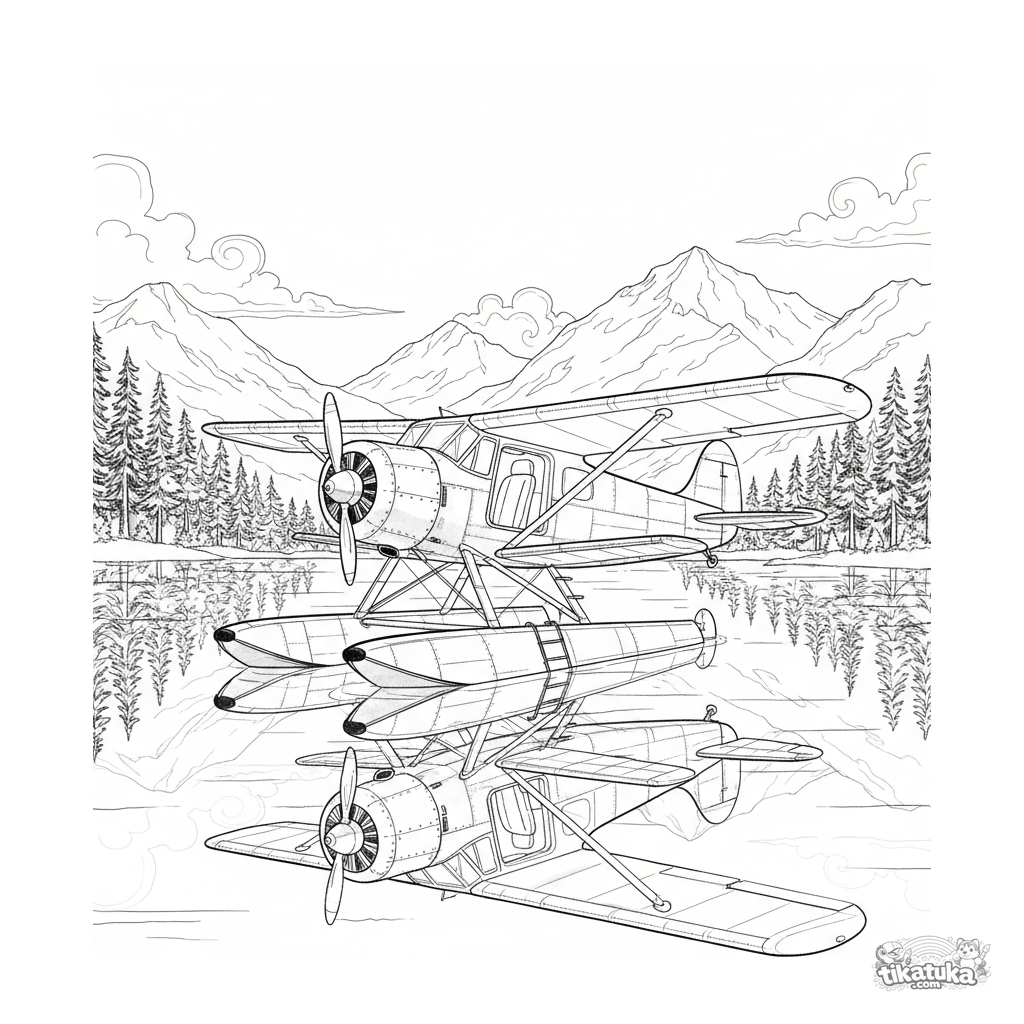 Detailliertes Ausmalbild im Aquarell-Skizzen-Stil: Ein Wasserflugzeug mit Schwimmern ruht auf einem ruhigen Bergsee. Für ältere Kinder von 10-12 Jahren. Spiegelung im Wasser ist sichtbar.
