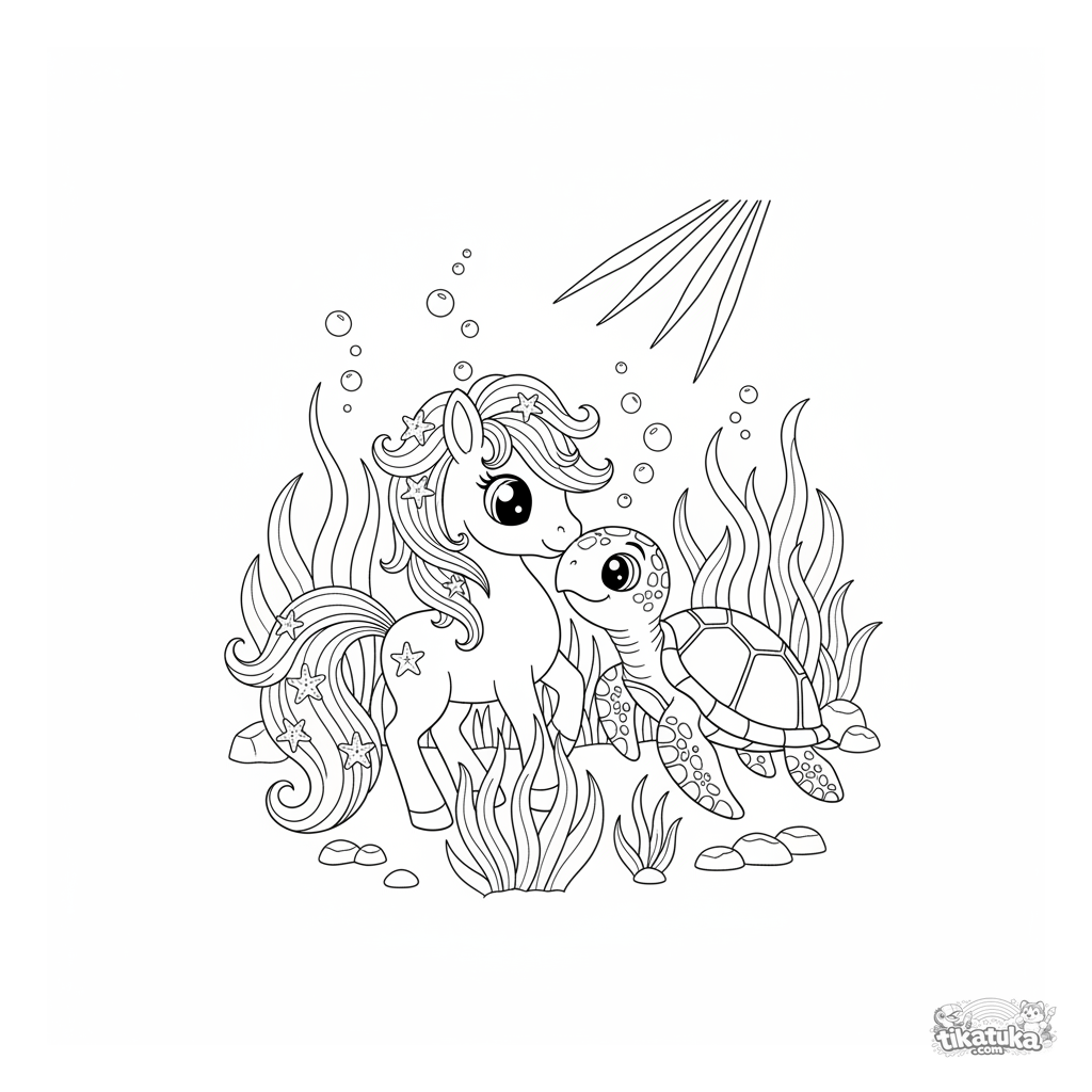 Ausmalbild für Mädchen von 4-6 Jahren: Ein magisches Seepony mit einer leuchtenden Algenmähne begrüßt eine freundliche Meeresschildkröte auf einer friedlichen Unterwasser-Seegraswiese.
