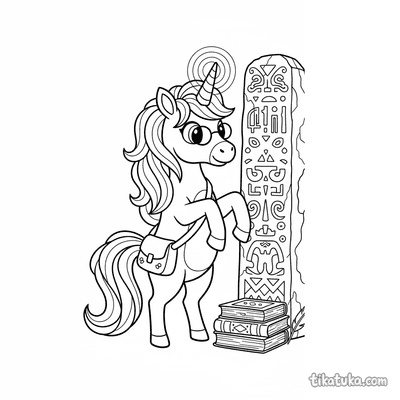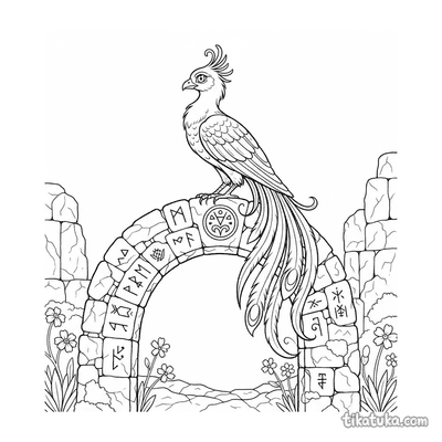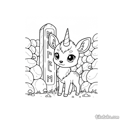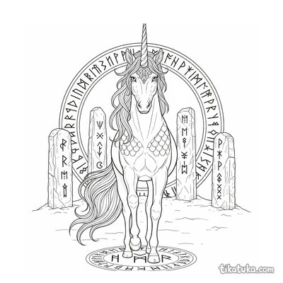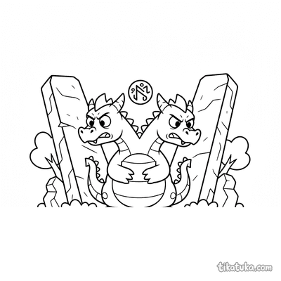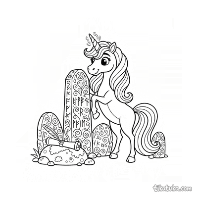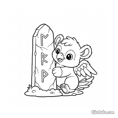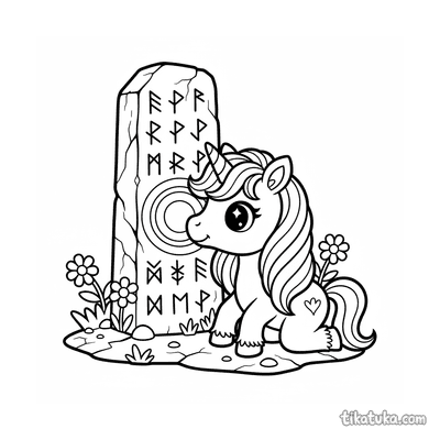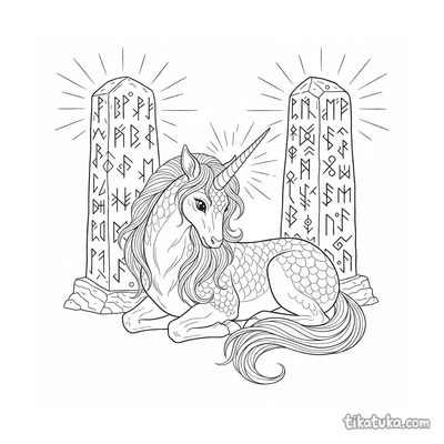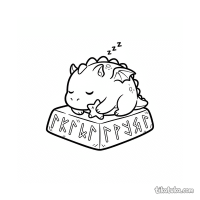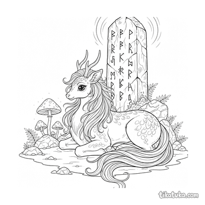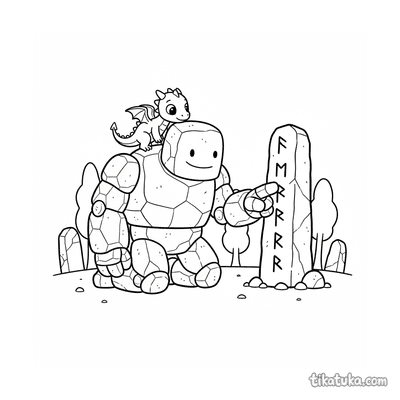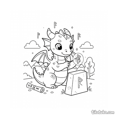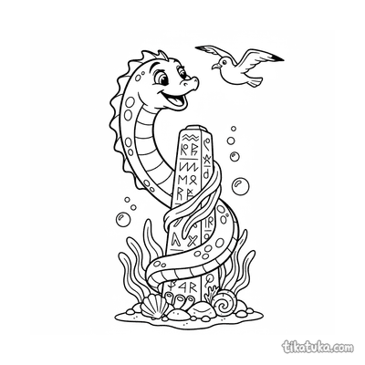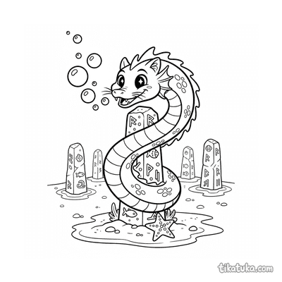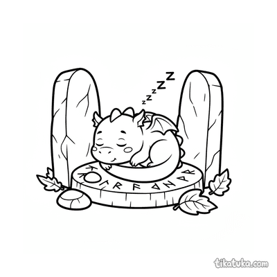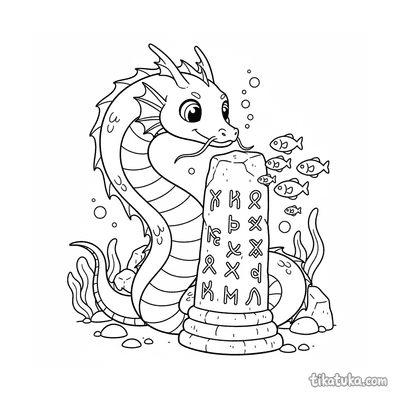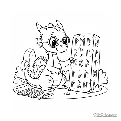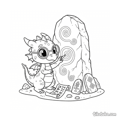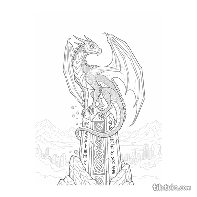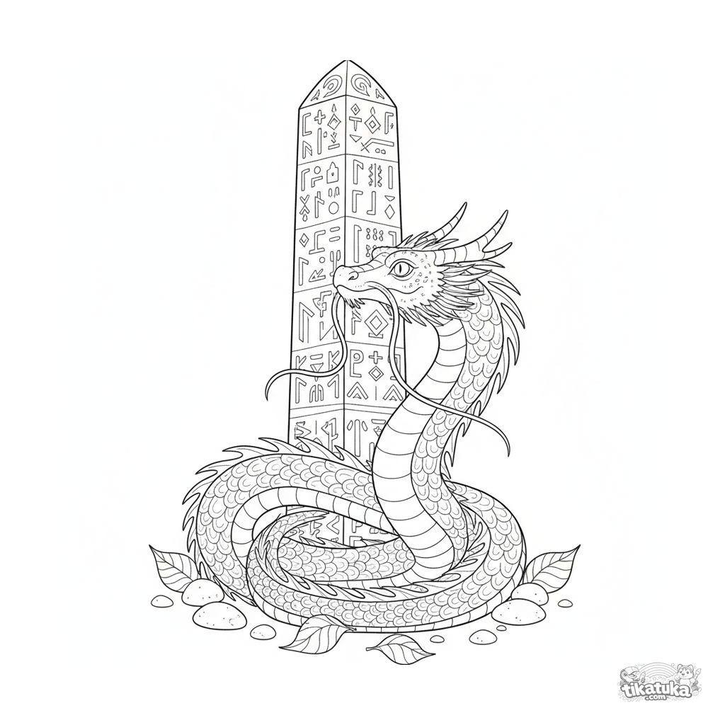 Ausmalbild für 10-12 Jahre: Ein detaillierter, schlangenartiger Drache windet sich um einen alten Runenmonolithen. Saubere Umrisse, naturalistische Proportionen, Legenden-Atmosphäre.