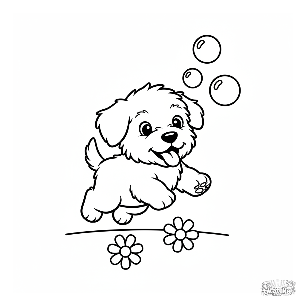 Einfaches Ausmalbild für Kleinkinder: Ein zotteliger Schäferhundwelpe jagt fröhlich Seifenblasen auf einer Wiese. Große, einfache Formen mit breiten weißen Rändern.