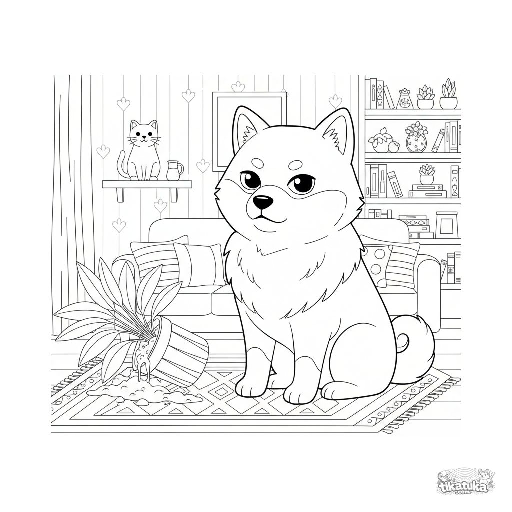 Ausmalbild für Kinder von 7 bis 12 Jahren: ein Shiba Inu mit einem beredsamen Seitenblick schaut auf eine umgekippte Zimmerpflanze in einem modernen Wohnzimmer. Meme-Szene mit Humor.
