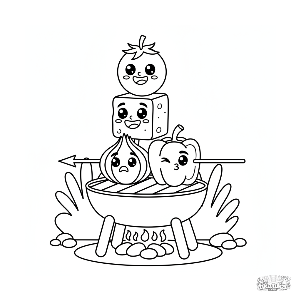 Ausmalbild für Kinder 7-9: Fröhliche Essensstücke auf einem Spieß—Tomate, Käse, Zwiebel, Paprika—warten auf dem Grill. Comic-Stil, verschiedene Emotionen.