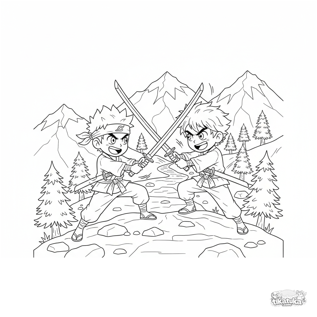 Dynamisches Shonen-Anime-Ausmalbild: Zwei Freunde trainieren mit Holzschwertern in den Bergen. Eine komplexe, actiongeladene Szene für ältere Kinder von 10-12 Jahren.