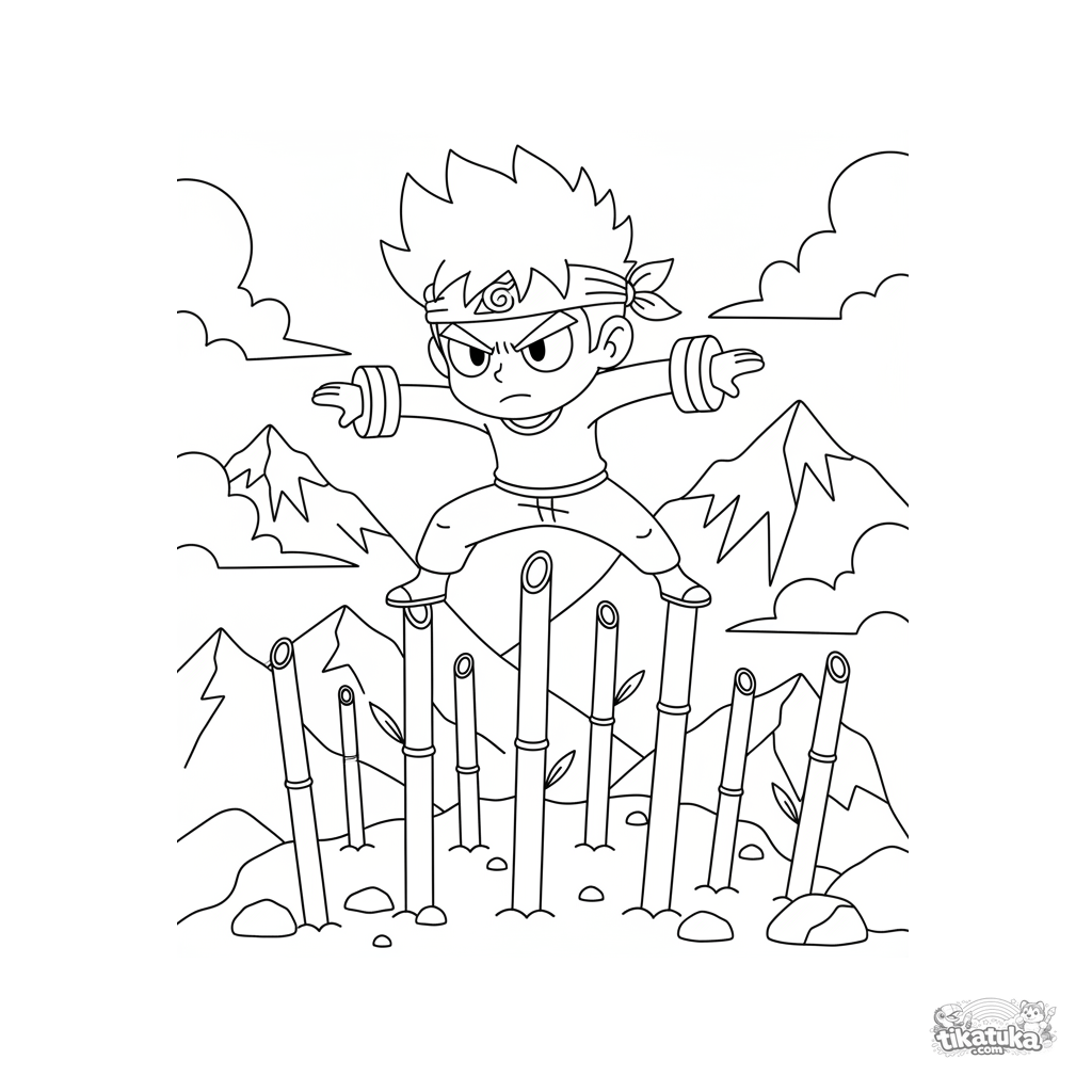 Dynamisches Shonen-Anime-Ausmalbild für 10-12 Jahre: ein Held balanciert auf Bambusstangen in einem nebligen Bergtrainingsgelände.
