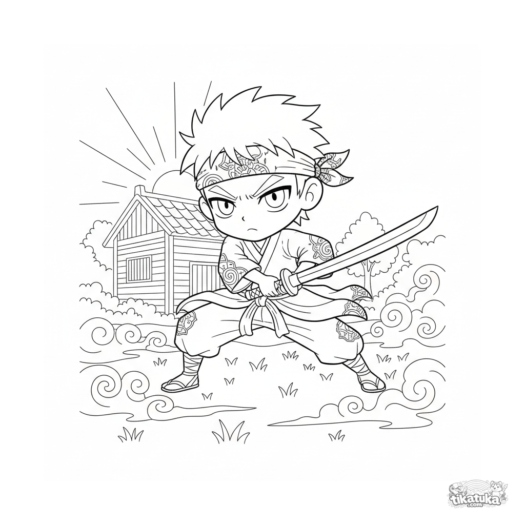 Shonen-Anime-Ausmalbild: Ein Held trainiert mit einem Holzschwert bei Sonnenaufgang in der Nähe eines Dojos. Für 10-12 Jahre mit detailliertem Hintergrund.