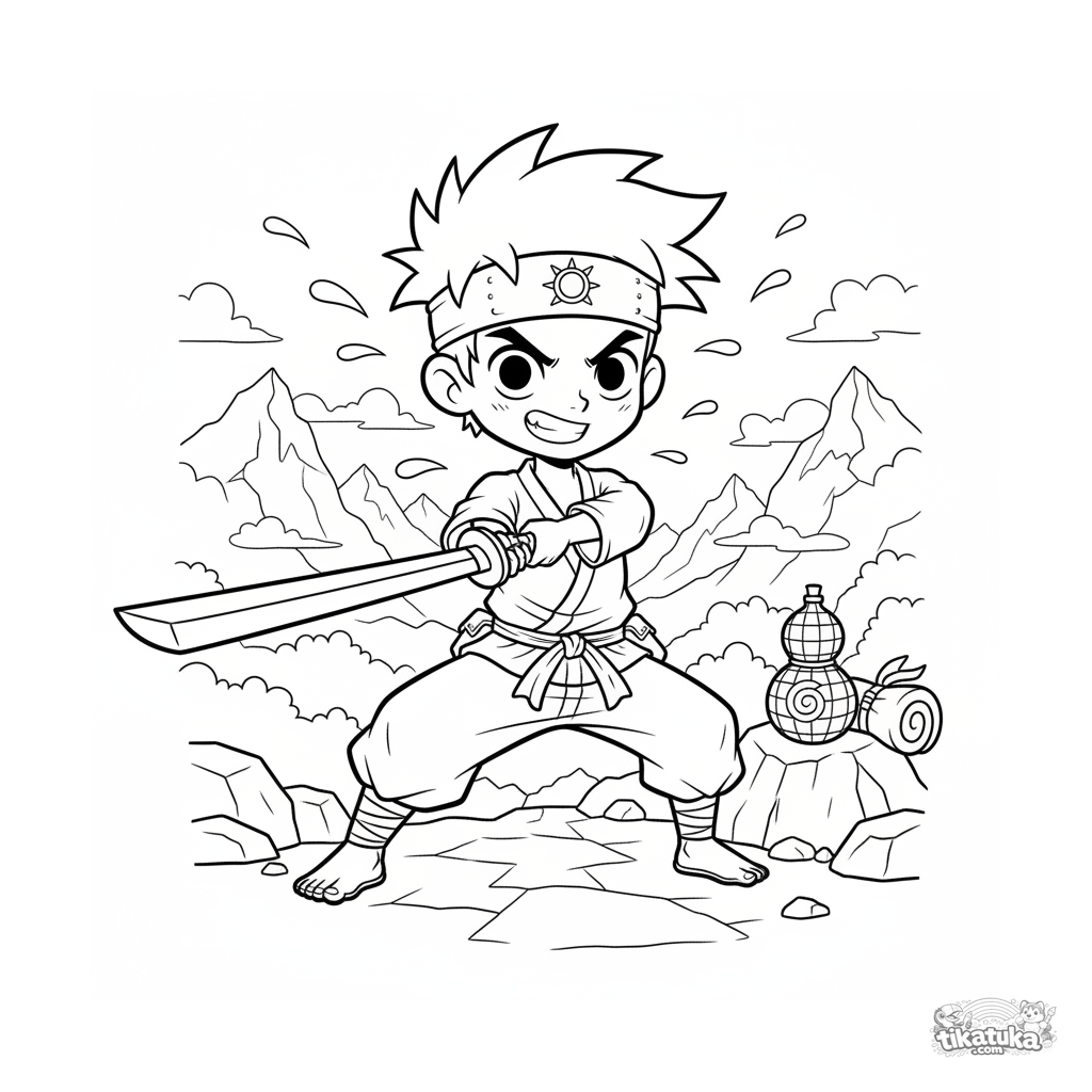 Dynamisches Shonen-Anime-Ausmalbild: Ein Held trainiert mit einem Holzschwert auf einem Bergpfad bei Sonnenaufgang. Detaillierte Landschaft und Pose für Kinder von 10-12 Jahren.