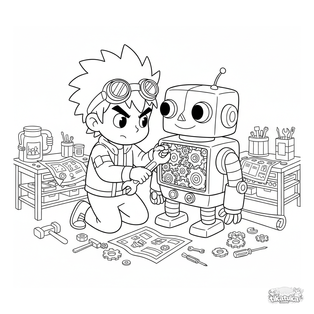 Detailliertes Shonen-Anime-Ausmalbild: Ein junger Mechaniker repariert einen Roboter in einer unordentlichen Werkstatt. Viele verzwickte Elemente für 10-12-Jährige.