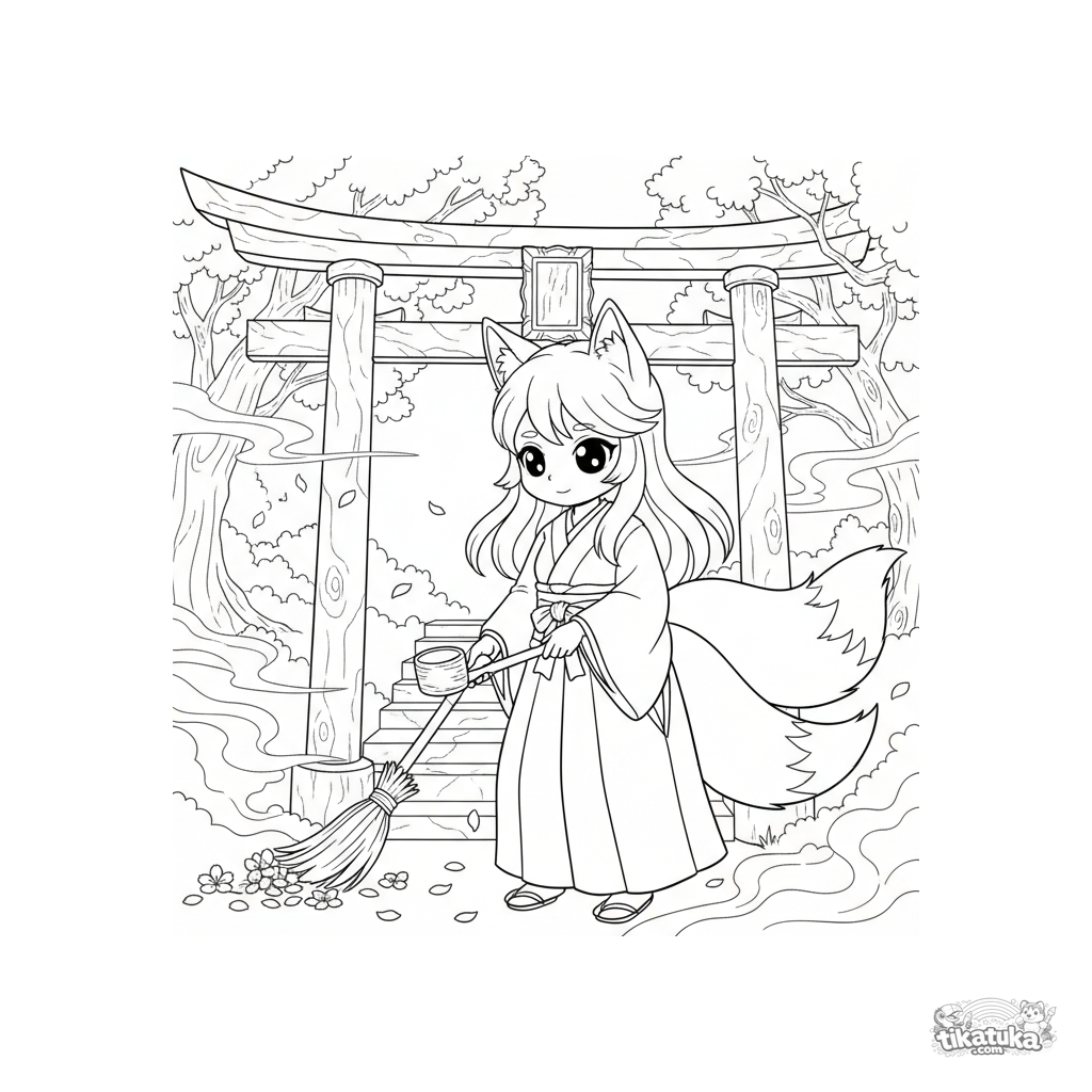 Anime-Ausmalbild: Ein Fuchsgeist-Schreinmädchen reinigt ein Steintorii im Morgengrauen. Detaillierte Szene für Kinder von 10-12 Jahren.