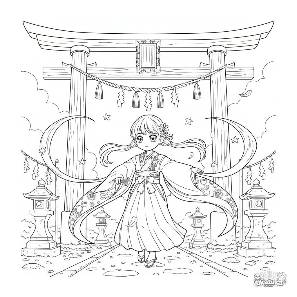 Anime-Ausmalbild für 10-12 Jahre: ein Schreinmädchen führt einen zeremoniellen Kagura-Tanz unter einem riesigen Torii-Tor in einem Herbstschrein auf.
