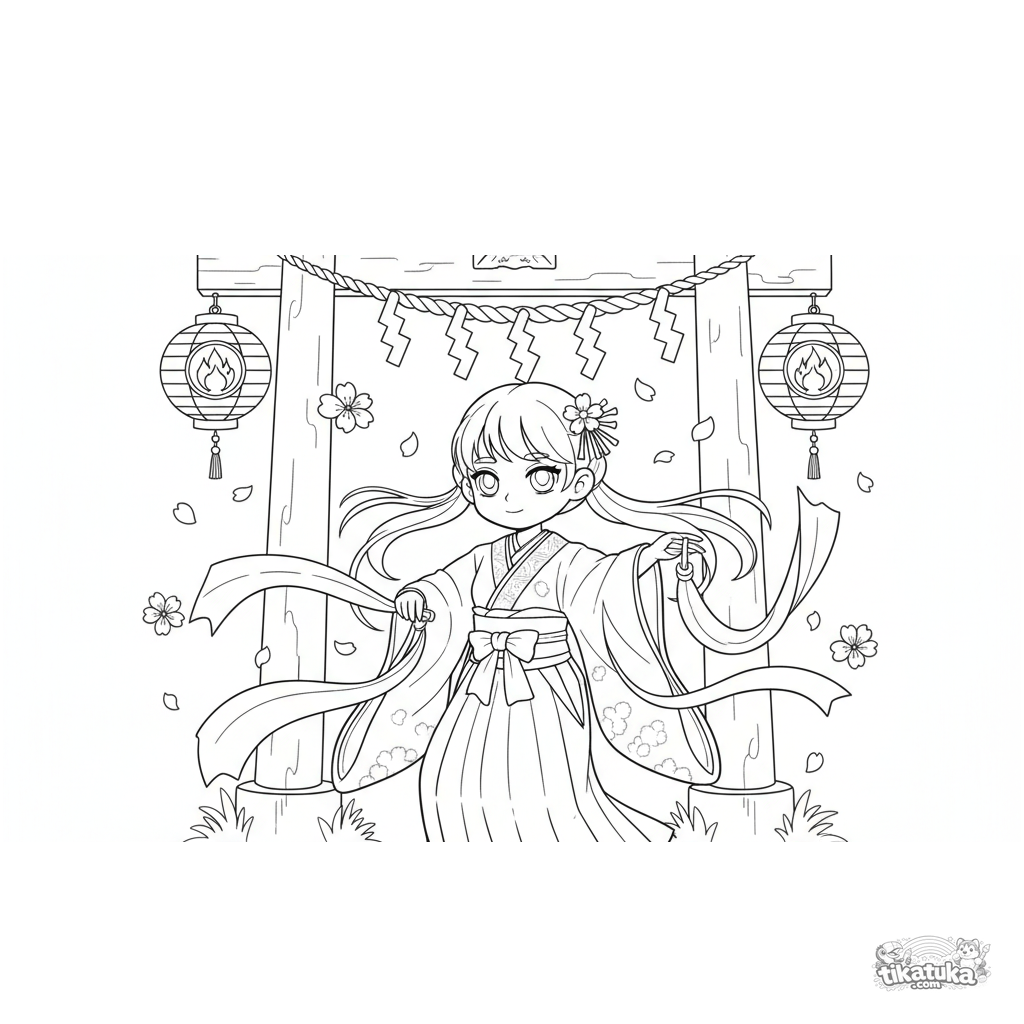 Anime-Ausmalbild: Ein Schreinmädchen führt einen rituellen Kagura-Tanz unter Torii-Toren auf. Detaillierte Szene für ältere Kinder von 10-12 Jahren.
