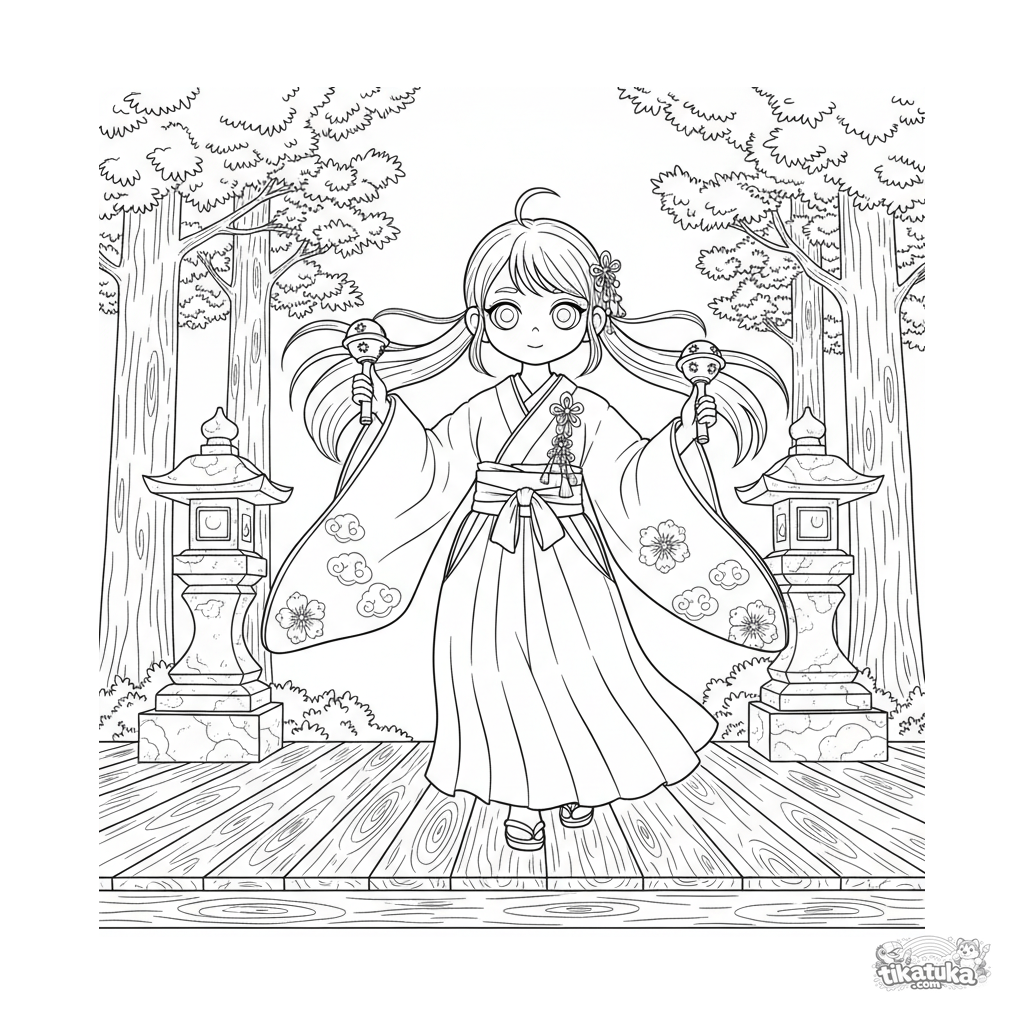 Anime-Ausmalbild für 10-12 Jahre: ein junges Schreinmädchen führt einen zeremoniellen Kagura-Tanz mit Glocken auf einer Schreinbühne auf, umgeben von Steinlaternen und Sicheltannen.