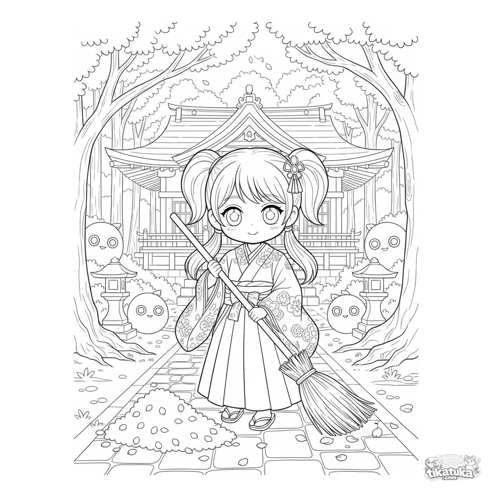 Detailliertes Anime-Ausmalbild: Ein Schreinmädchen fegt den Hof mit Hilfe von Kodama-Waldgeistern. Szene mit Hintergrund für 10-12 Jahre.