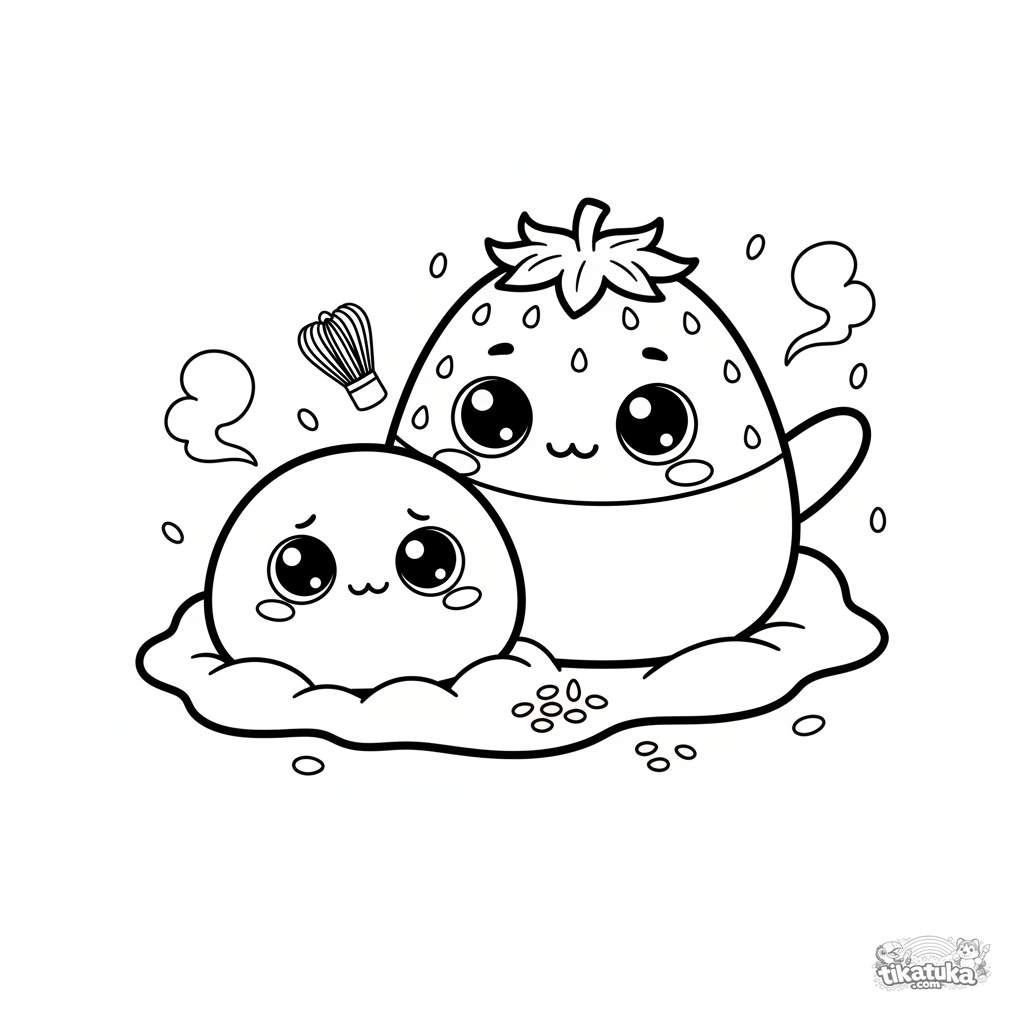 Ausmalbild für Kinder 4-6: ein schüchterner Matcha-Mochi versteckt sich hinter seinem Freund, einem Erdbeer-Mochi. Eine süße Szene über Freundschaft und Emotionen.