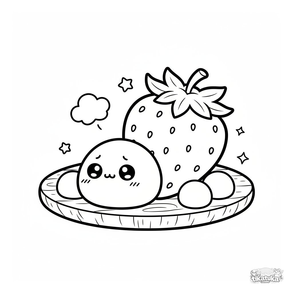 Ausmalbild für Kinder 4-6: Ein süßer, schüchterner Mochi lugt hinter einer Riesen-Erdbeere auf einem Dessertteller hervor. Einfache und niedliche Szene.