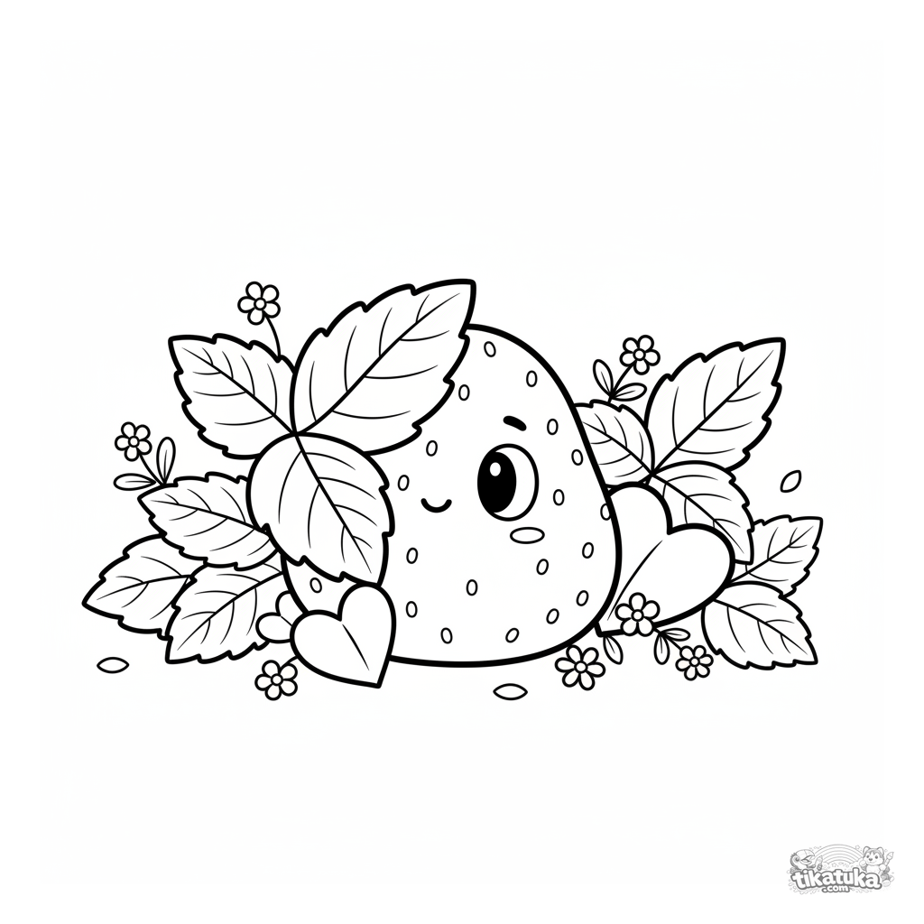 Ausmalbild für Kinder von 4-6 Jahren: ein schüchternes Mochi, das hinter einem Erdbeerblatt hervorlugt. Süße Gartenszene mit Blumen und Blättern.