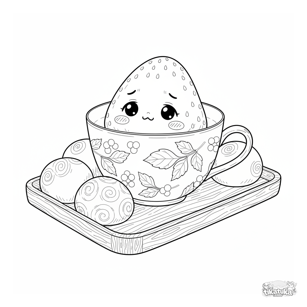 Realistisches Ausmalbild: Ein schüchterner Erdbeer-Mochi lugt hinter einer Porzellantasse hervor. Detailliertes Stillleben für 10-12 Jahre.