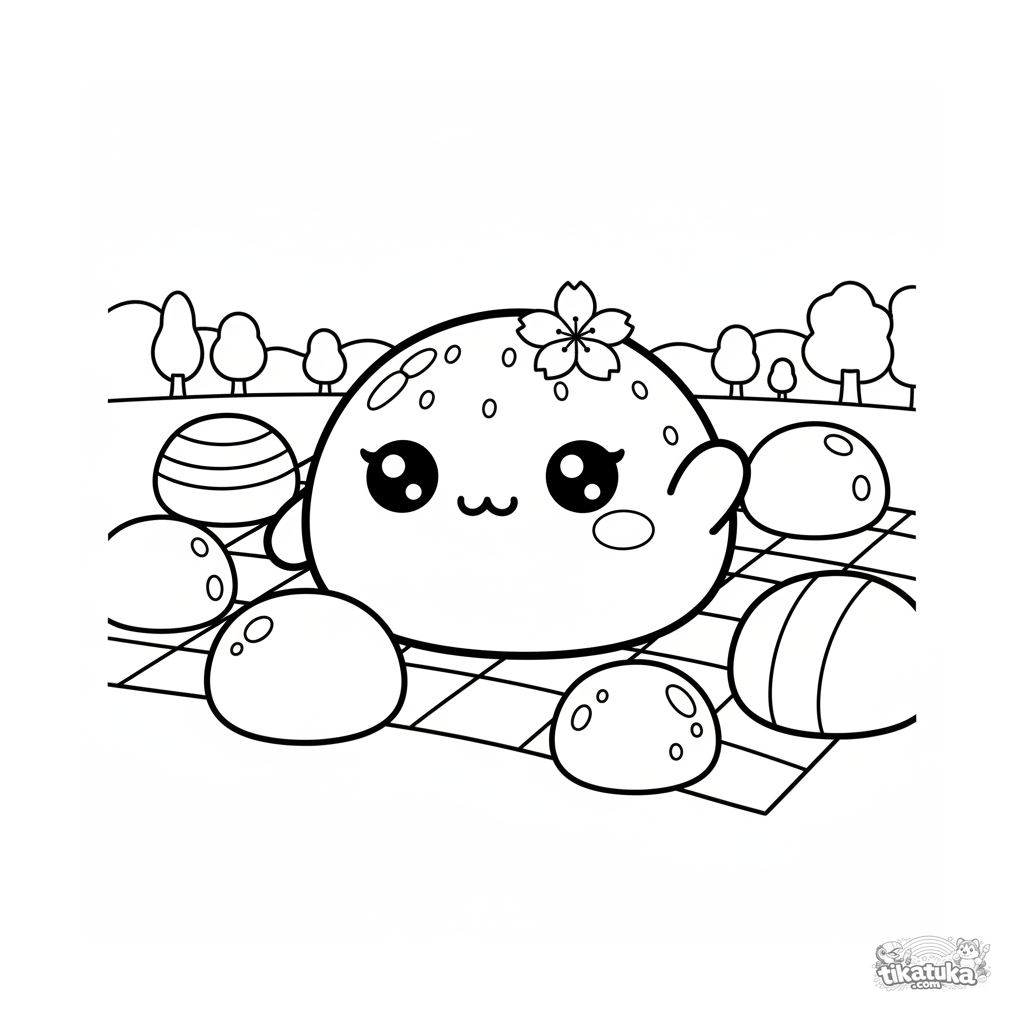 Ausmalbild für Kinder von 7-9 Jahren: ein schüchterner Erdbeer-Mochi sitzt auf einer karierten Picknickdecke.