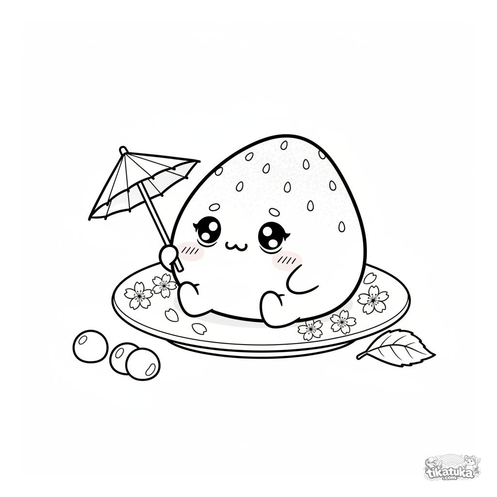Ausmalbild eines schüchternen Erdbeer-Mochis mit einem Papierregenschirm auf einem Teller. Kawaii-Stil Szene für Kinder von 7 bis 9 Jahren.