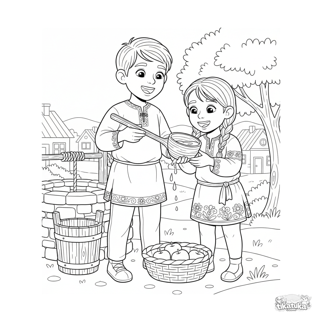 Ausmalbild für ältere Kinder 10-12: Geschwister teilen Wasser vom Brunnen mit lebendigem Wasser. Realistischer Feldhandbuch-Stil, Szene zentriert.