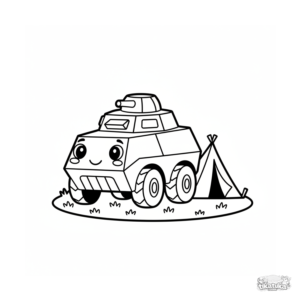 Ganz einfaches Ausmalbild für Kleinkinder 2-3 Jahre: Ein freundliches gepanzertes Auto mit lächelndem Kühlergrill, geparkt neben einem Zelt. Große Formen, dicke Umrisse, viel Freiraum zum Ausmalen.