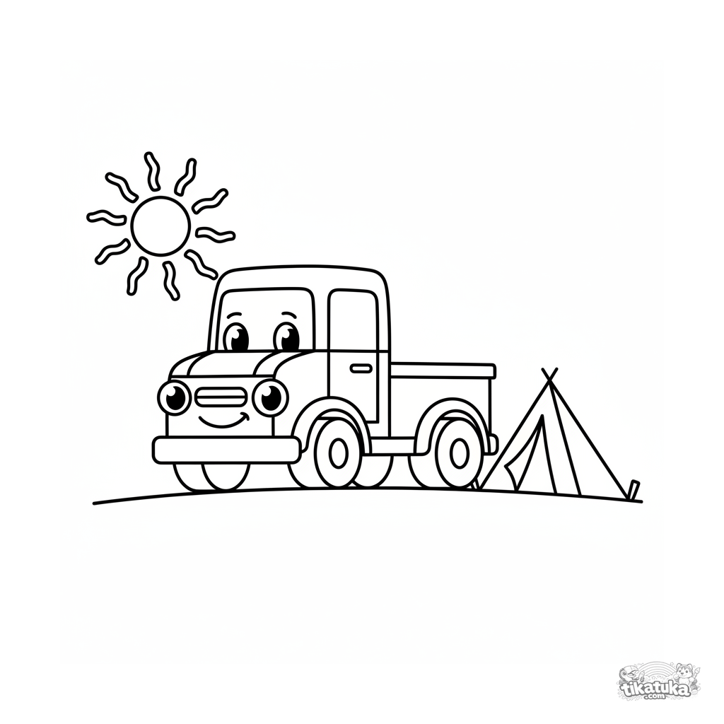 Ganz einfaches Ausmalbild für Kleinkinder von 2-3 Jahren: Ein lächelnder Armeelaster steht am Zelt. Große weiße Ränder, dicke Umrisse.