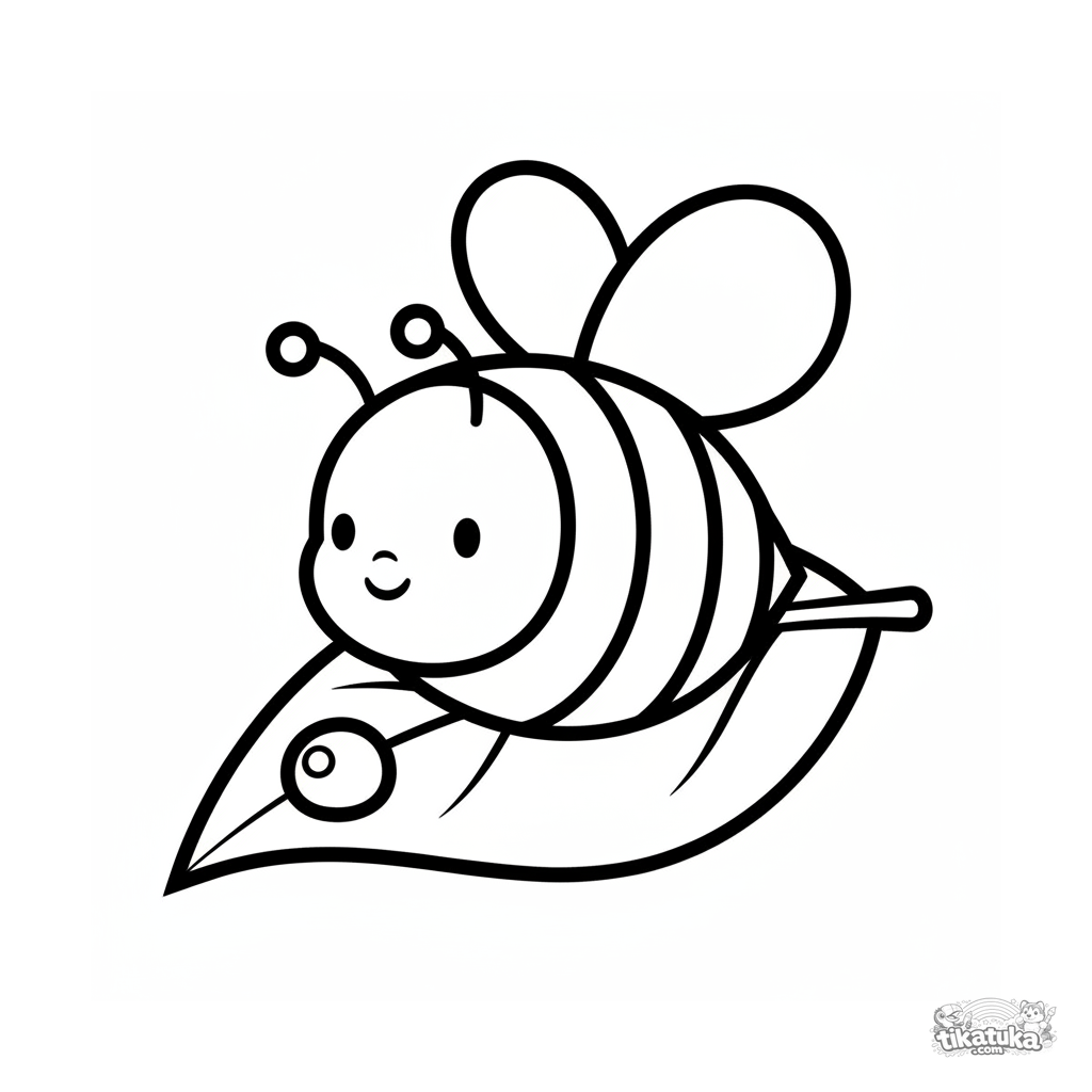 Ganz einfaches Ausmalbild für Kleinkinder 2-3: Eine niedliche kleine Biene sitzt auf einem großen Blatt neben einem Tautropfen. Große, klare Formen.