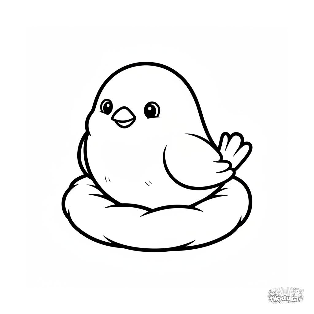 Ausmalbild für 2-3-Jährige: ein einfacher Vogel sitzt auf einem Kissen, das wie ein Nest aussieht. Klare erkennbare Silhouette, minimalistisches Design.