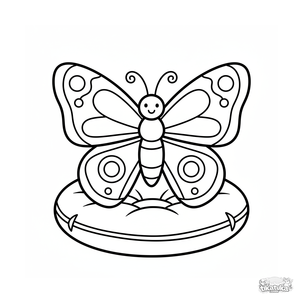 Realistisches Ausmalbild für Kleinkinder: ein großer Schmetterling mit einfachen Flügelmustern liegt auf einem Kissen. Klarer symmetrischer Umriss.