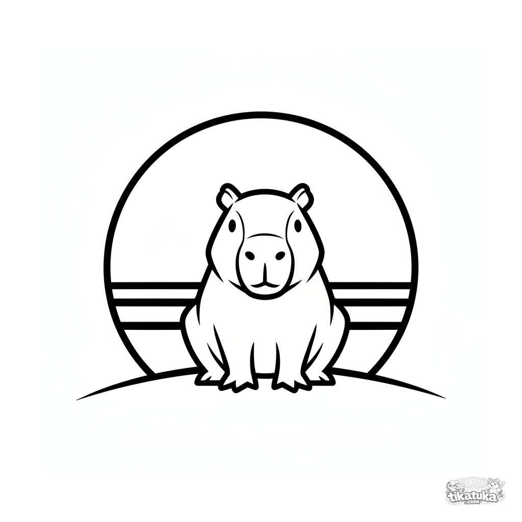 Sehr einfaches Ausmalbild für Kleinkinder 2-3: Ein großes Capybara sitzt auf einem Hügel vor einem Sonnenuntergang. Große Formen, breite Ränder für erste Malerfahrung.