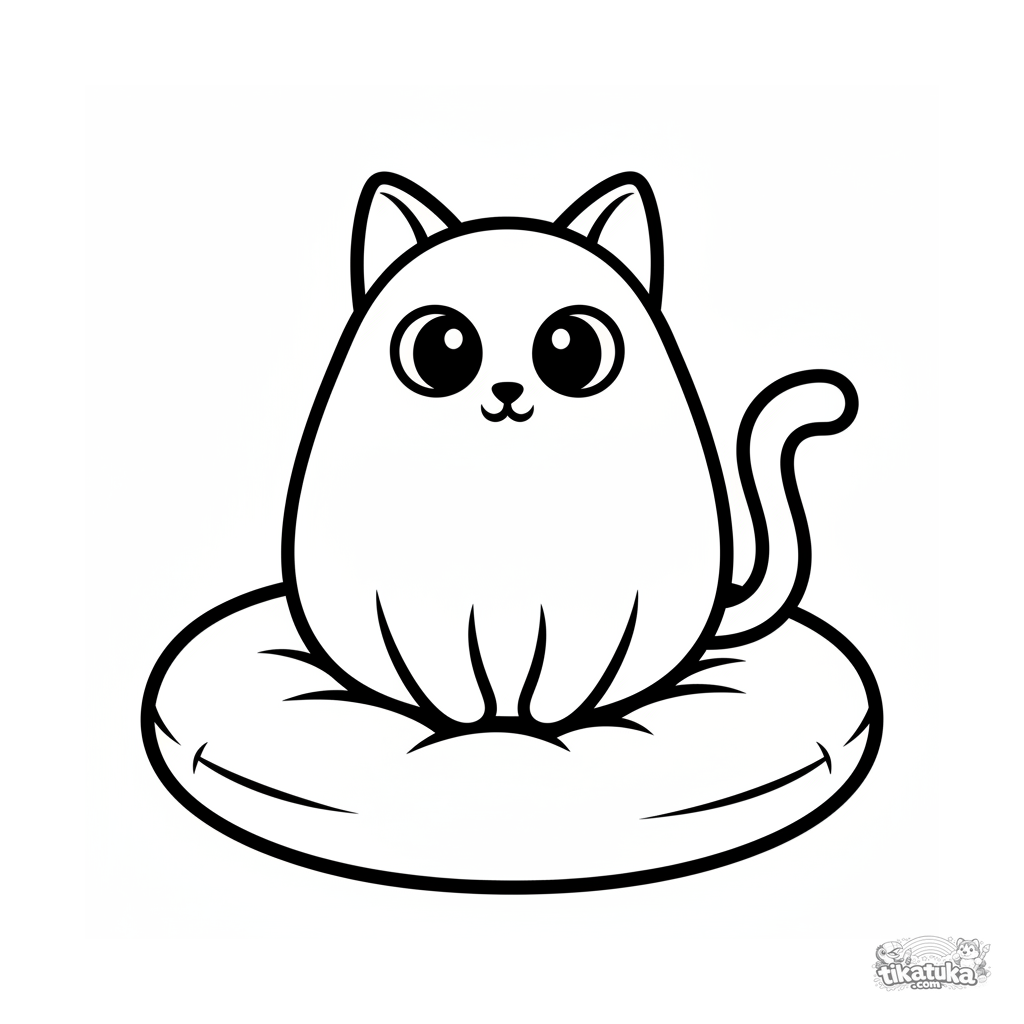 Katzen-Ausmalbild für 2-3 Jahre: eine einfache Katze mit rundem Körper sitzt auf einem Kissen. Klare dicke Umrisse, keine winzigen Details.