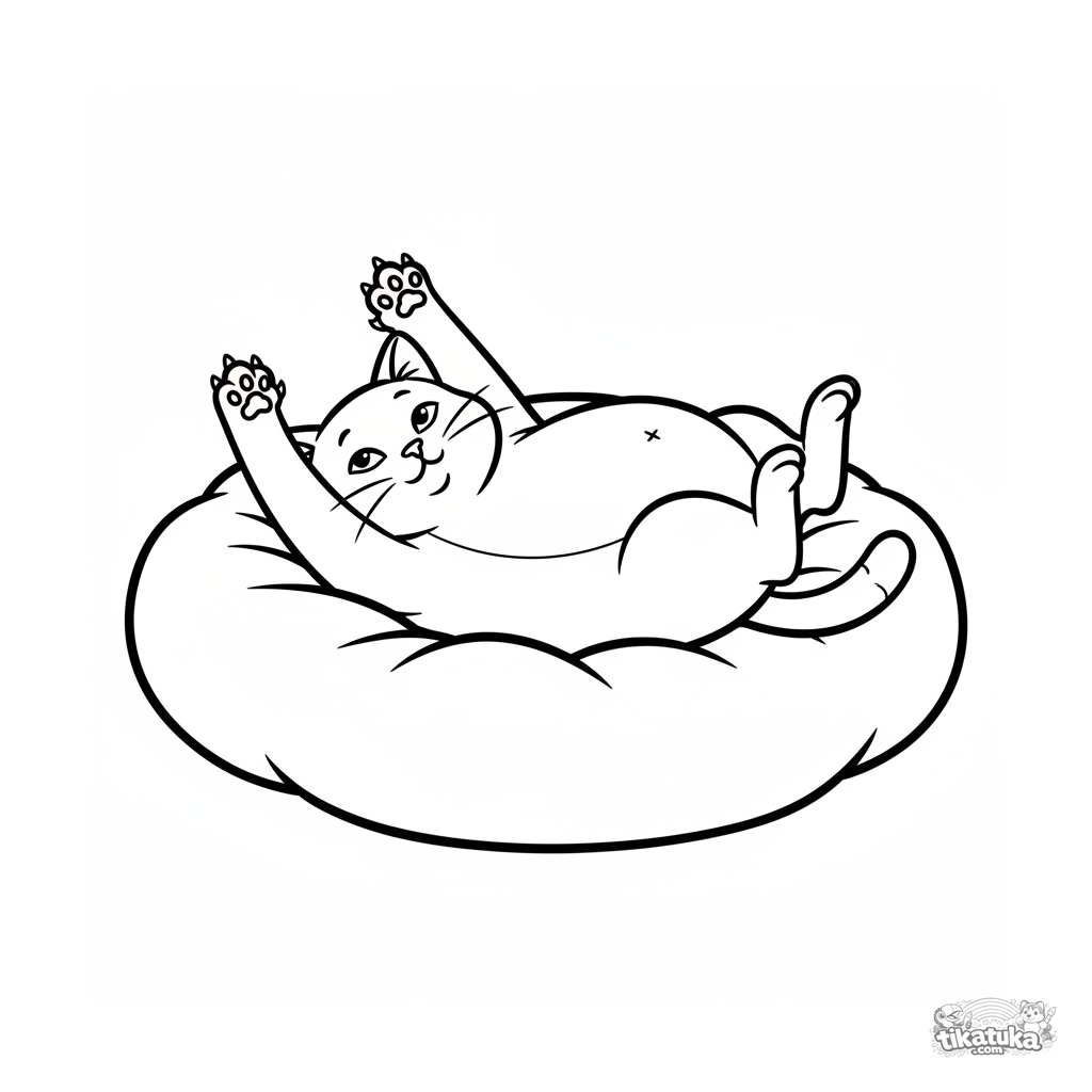 Ausmalbild für Kleinkinder: eine Katze in einfachem realistischen Stil streckt sich auf einem Kissen. Klare Umrisse, große Formen.