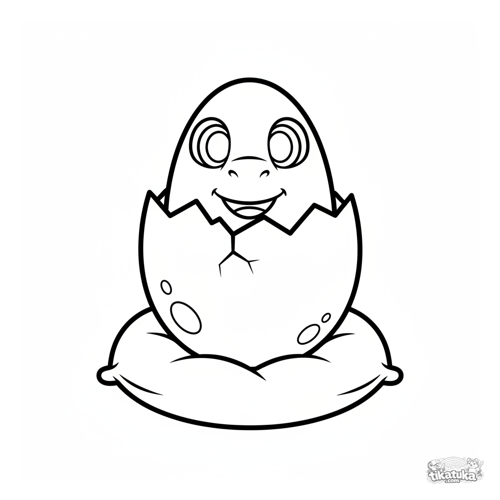 Ausmalbild für Kleinkinder: ein großes Dinosaurier-Ei mit einem freundlichen Gesicht, das aus einem Riss lugt, sitzt auf einem weichen Kissen. Saubere Umrisse, minimale Details, perfekt für 2-3 Jahre.