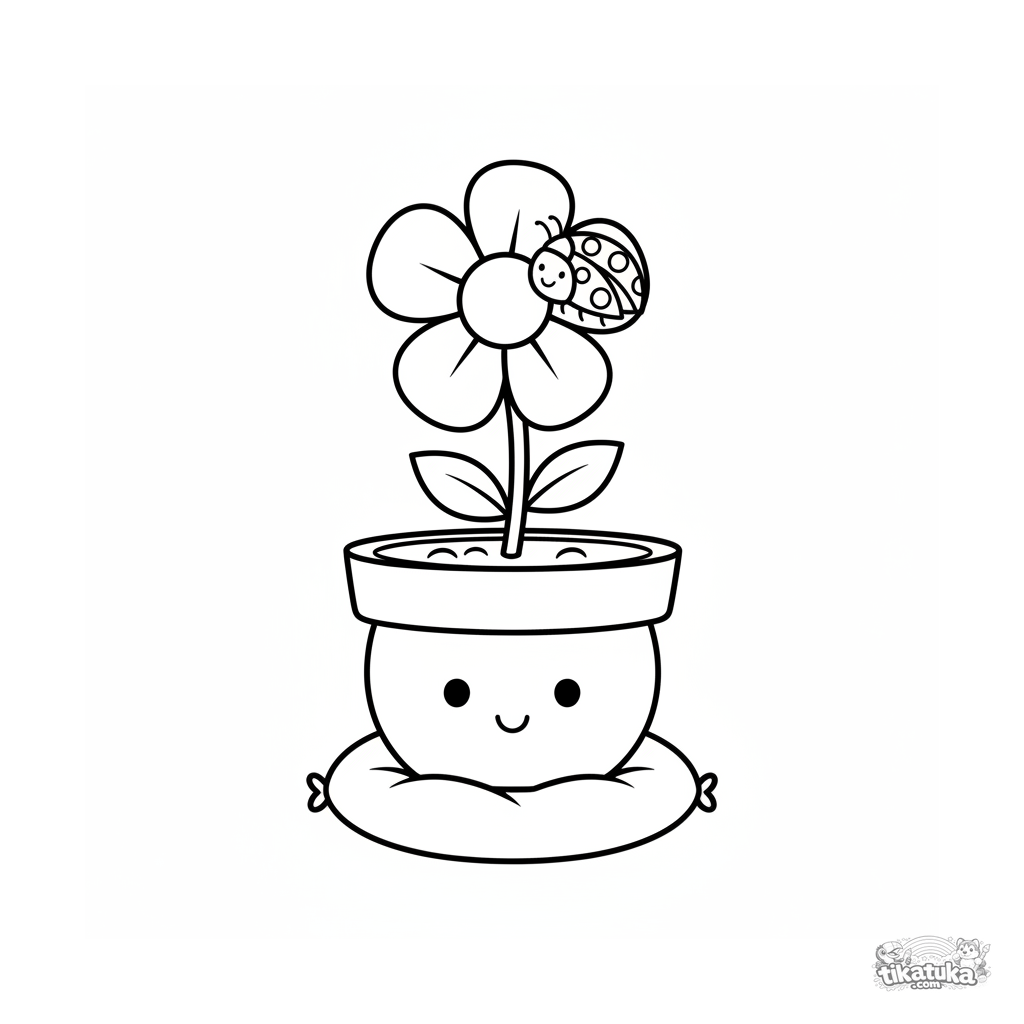 Kinder-Malmalbild für 2-3 Jahre: eine lächelnde Blume im Topf steht auf einem weichen Kissen, ein Marienkäfer sitzt auf einem Blütenblatt. Sehr einfache Umrisse.