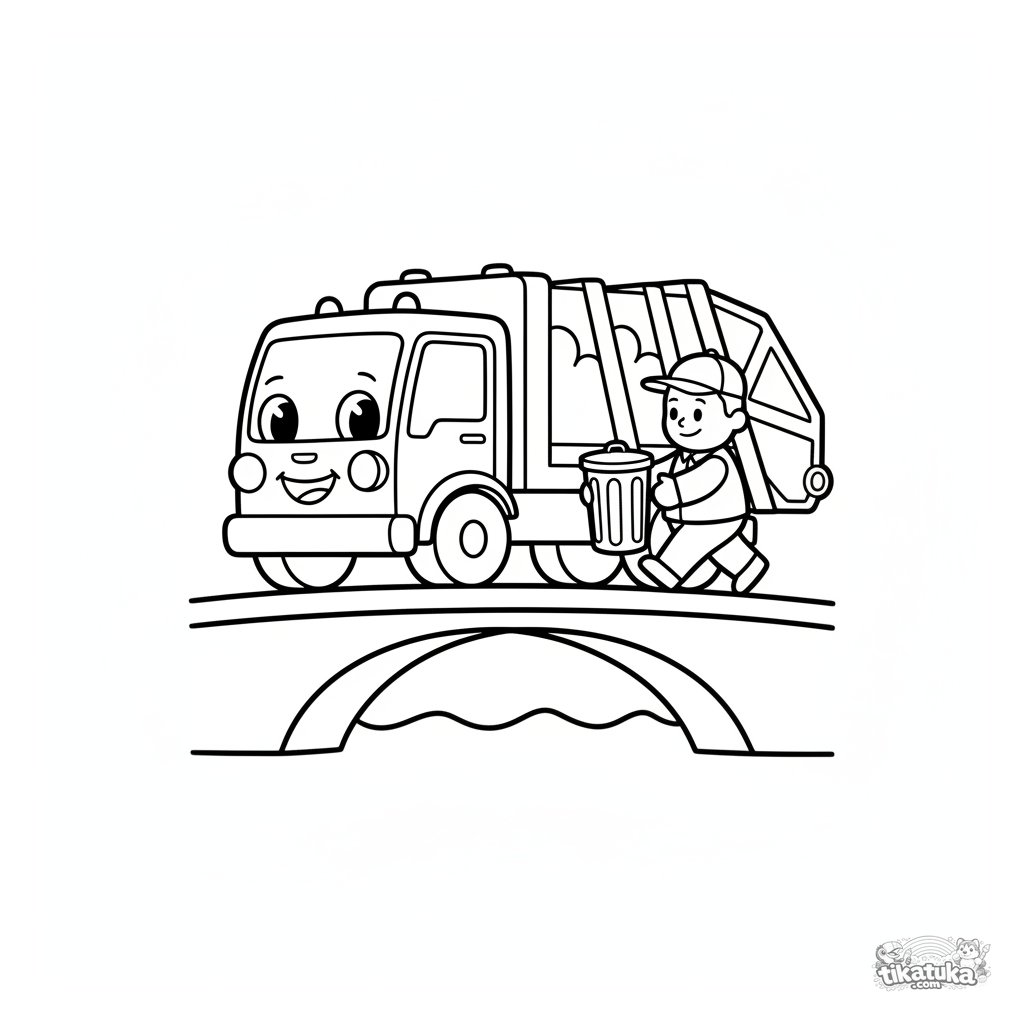 Sehr einfaches Ausmalbild für Kleinkinder 2-3: Ein freundlicher Müllwagen fährt über eine Brücke. Riesige einfache Formen, kaum Details, perfekt für die Jüngsten.