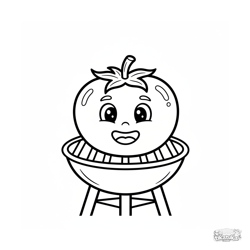 Ganz einfaches Ausmalbild für Kleinkinder 2-3: eine große fröhliche Tomate auf einem Grill. Große Formen und dicke Umrisse sind perfekt für erste Buntstifte.