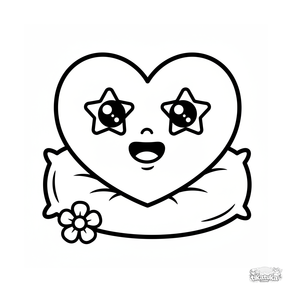 Sehr einfaches Ausmalbild für 2+ Jahre: ein großes Herz mit einem lächelnden Gesicht ruht auf einem Kissen. Perfekt für erste Malerfahrungen.