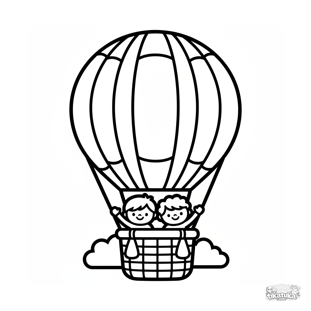 Sehr einfaches Ausmalbild für Kleinkinder 2-3: Ein gestreifter Heißluftballon mit einem Korb, in dem Kinder sitzen.