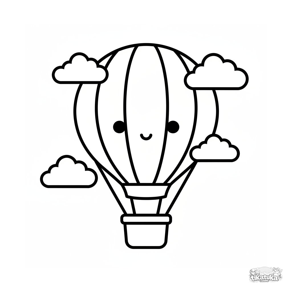 Sehr einfaches Ausmalbild für Kleinkinder 2-3 Jahre: ein gestreifter Heißluftballon schwebt in den Wolken. Große Flächen zum Ausmalen.
