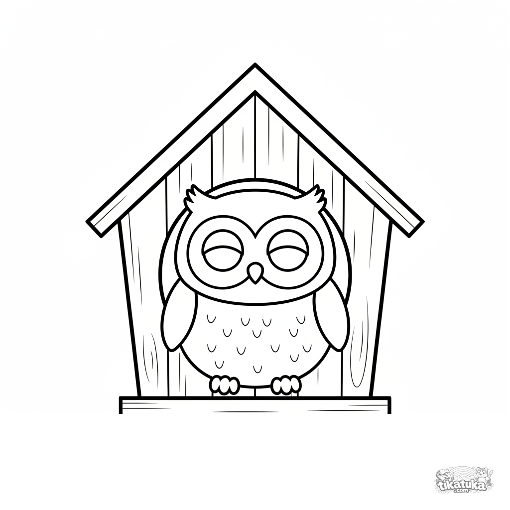 Ganz einfaches Ausmalbild für Kleinkinder 2-3: eine runde Baby-Eule im Vogelhaus. Große Formen, dicke Umrisse, viel Freiraum.
