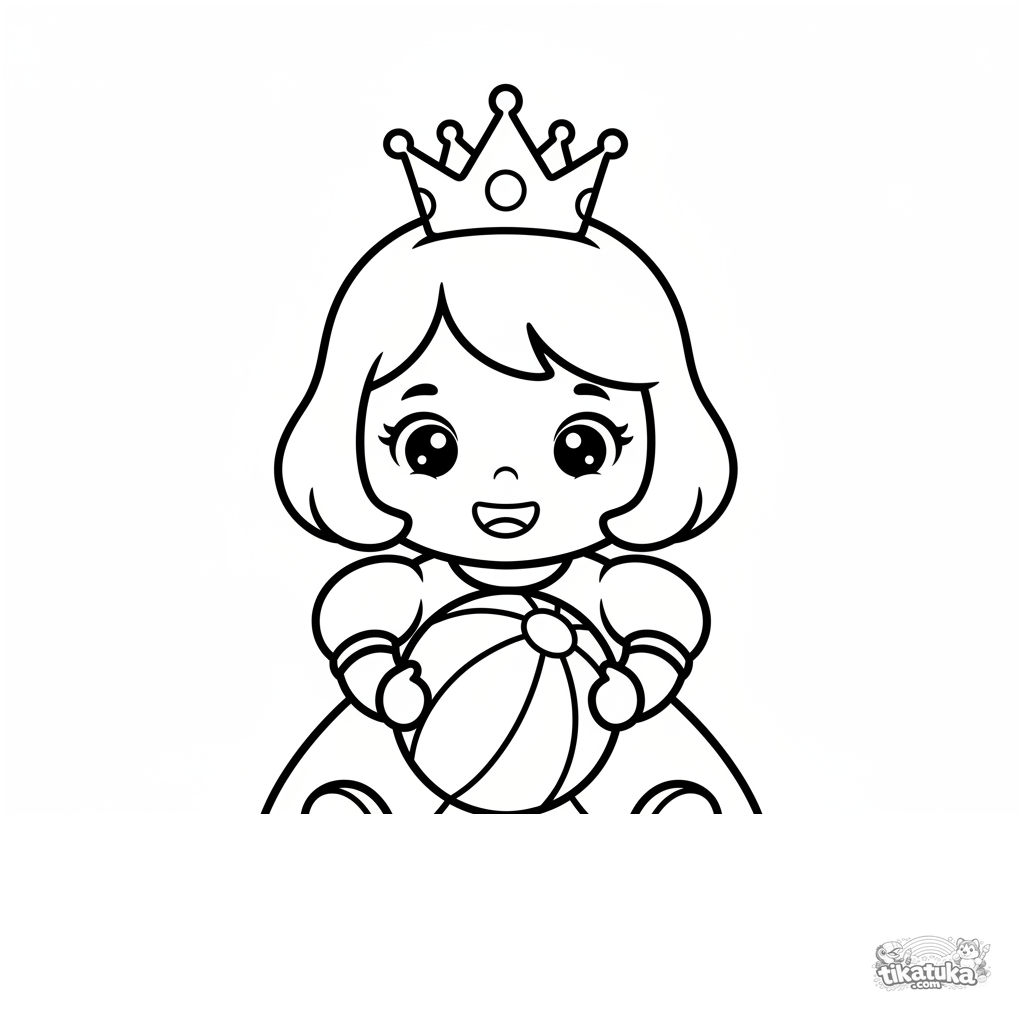Sehr einfaches Ausmalbild für Kleinkinder 2-3: Eine süße Prinzessin mit großer Krone sitzt und hält einen Ball. Große Formen, dicke Umrisse, perfekt für erste Buntstifte.