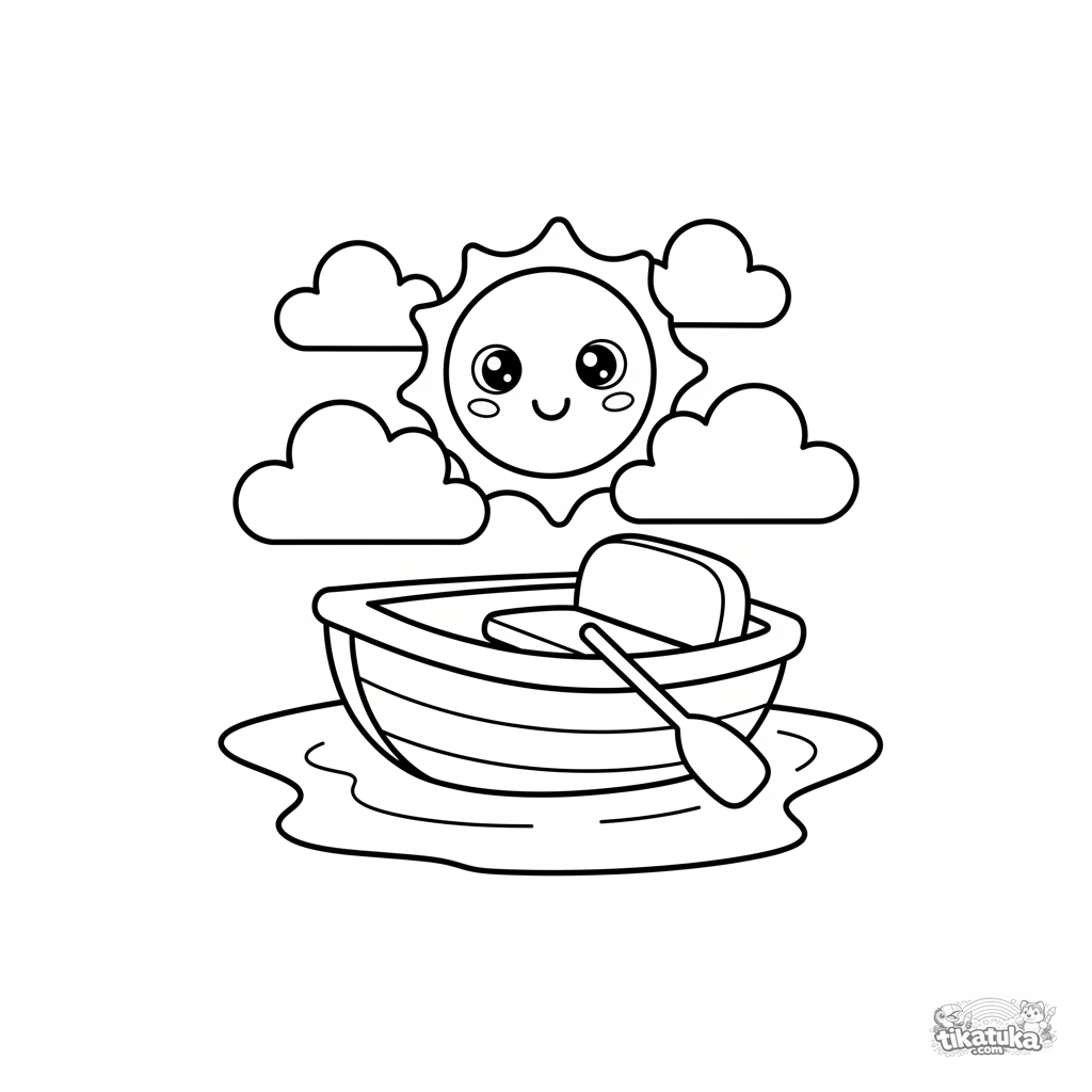 Ganz einfaches Ausmalbild für Kleinkinder 2-3: Ein rundes Ruderboot schwimmt auf einem ruhigen Teich. Große Formen, dicke Umrisse, viel Freiraum zum Ausmalen.