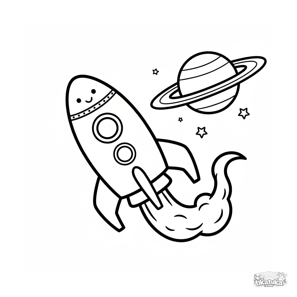 Ganz einfaches Ausmalbild für Kleinkinder 2-3: Eine lächelnde Rakete fliegt zwischen Sternen in der Nähe eines Ringplaneten. Große, leicht auszumalende Formen.