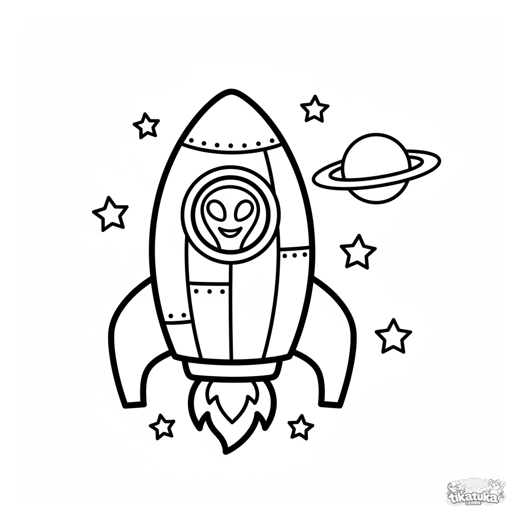 Sehr einfaches Kleinkind-Ausmalbild für 2-3 Jahre: Eine fröhliche Rakete mit einem lächelnden Alien im Fenster fliegt zwischen Sternen. Große, geschlossene Formen.