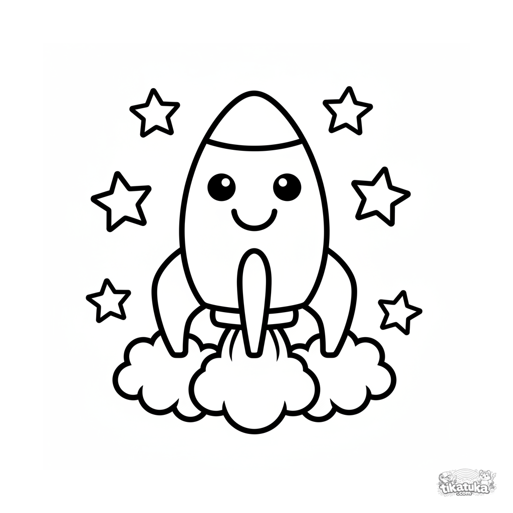 Ganz einfaches Ausmalbild für Kleinkinder 2-3: Eine lächelnde Rakete schwebt zwischen großen Sternen. Große Formen, dicke Umrisse.