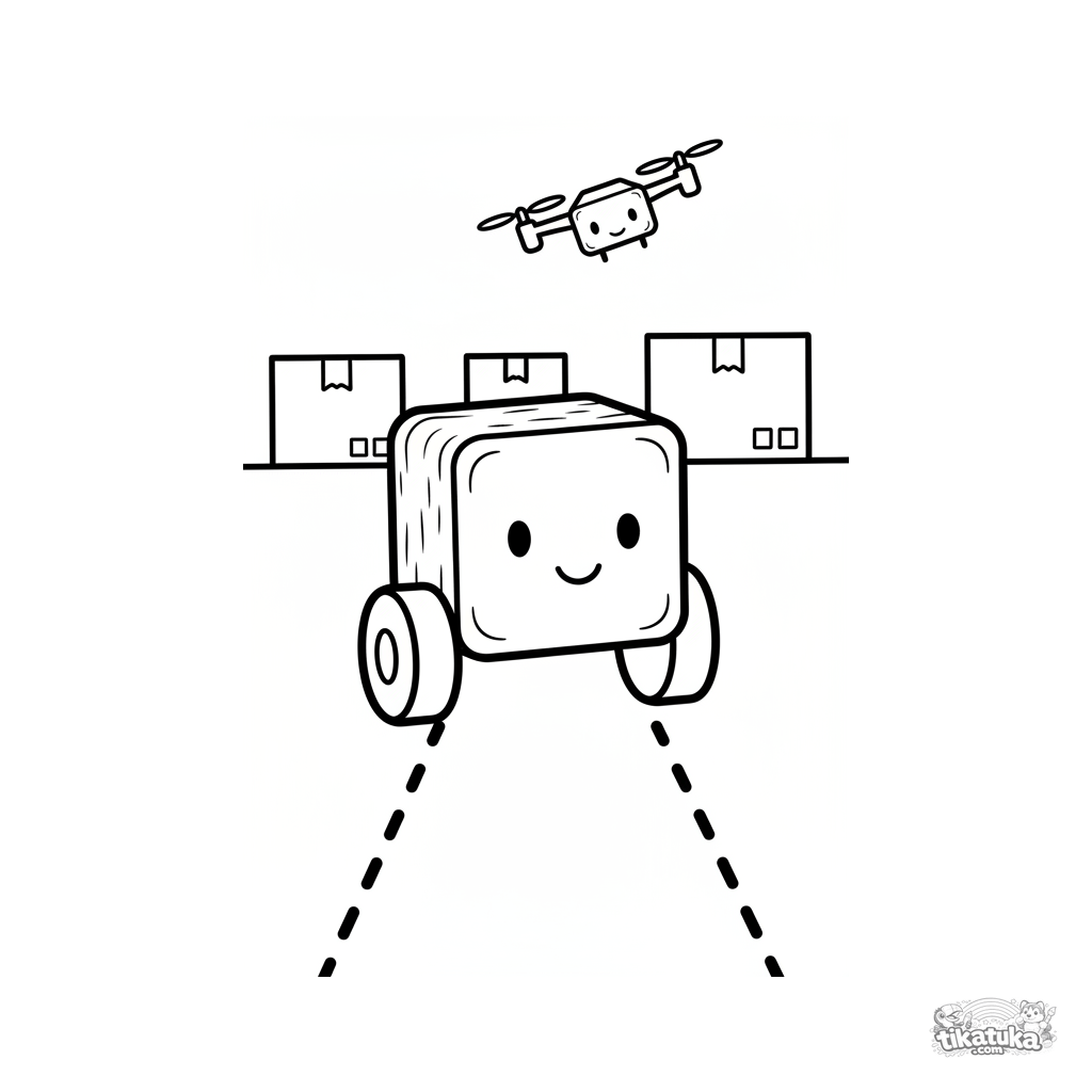 Ausmalbild für Kleinkinder 2-3: Ein einfacher Würfel-Roboter rollt in einem Lagerhaus. Riesige Flächen zum Ausmalen, sehr einfache Formen, lächelndes Gesicht.